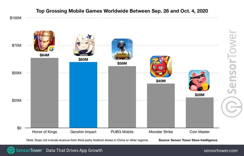 Pendant la même période du 28 septembre au 4 octobre, Genshin Impact a enregistré des revenus impressionnants de 60 millions de dollars sur mobile, selon l'analyse de Sensor Tower. Pour mettre cela en perspective, des jeux comme Honor of Kings (Arena of Valor) ont généré 64 millions de dollars, tandis que PUBG Mobile a atteint 56 millions de dollars. La majorité des gains de Genshin Impact proviennent de la Chine, son marché principal, avec environ 25 millions de dollars, soit 42 % des revenus totaux. Le Japon suit de près avec 17 millions de dollars (29 %), puis les États-Unis avec 8 millions, représentant 13 % du total. Le modèle free-to-play du jeu repose sur une monnaie premium qui permet aux joueurs d'acquérir des personnages et des armes via un système de tirages aléatoires, appelé gacha. Il propose également un battle pass, ainsi que des packs d'objets payants. Disponible sur PS4 et PC, Genshin Impact s'apprête aussi à faire son apparition sur Nintendo Switch dans un avenir proche.